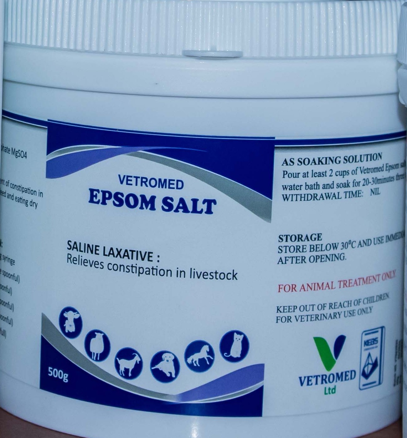 Epsom Salt (Magnesium Sulfate) is a versatile veterinary product commonly used as a magnesium supplement, muscle relaxant, and therapeutic soak for animals. It helps relieve muscle stiffness, reduce inflammation, and promote overall well-being in livestock and pets.